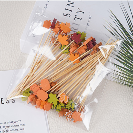 BambooMake.cn, 100 pieces/pack, 7 assorted Thanksgiving fruit picks. Thanksgiving decoration picks, maple leaf, pumpkin, pine cone mix, cocktail picks, hamburger picks, fruit pick manufacturer.